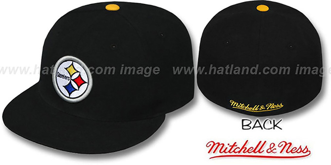 'Authentic' wool fitted hat by Mitchell & Ness with original cut and flat brim, black crown and visor with secondary color undervisor, old school Throwback team logo embroidery on front, Mitchell & Ness script embroidery on back . This Pittsburgh Steelers hat is made by Mitchell & Ness and is licensed by the NFL - National Football League.