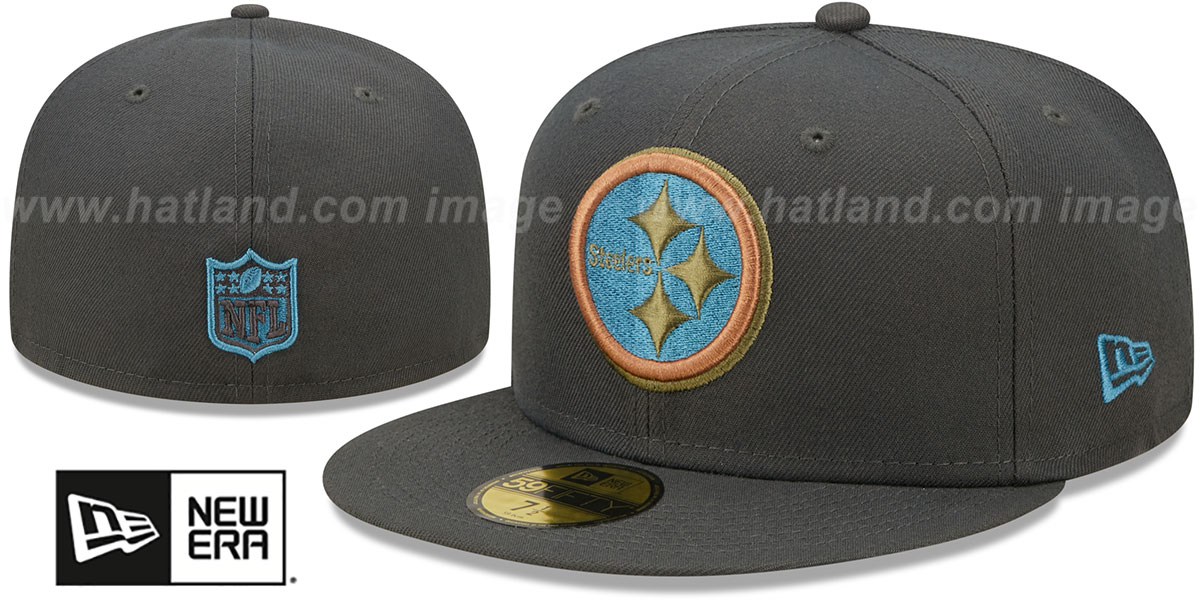 Authentic and ORIGINAL 59FIFTY fitted hat by New Era, charcoal (graphite) authentic poly crown and visor, light grey undervisor, multi colored raised embroidered team logo on front, slate blue embroidered New Era logo on side, matching raised embroidered NFL Shield logo on back. This Pittsburgh Steelers baseball cap is made by New Era and is licensed by the NFL - National Football League.