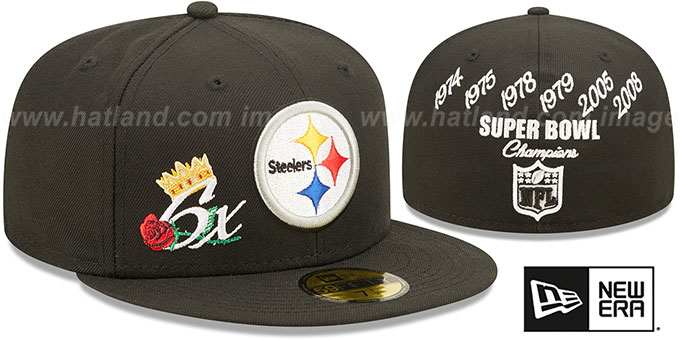Authentic and Original 59FIFTY fitted hat by New Era, black authentic poly crown and visor, light grey undervisor, raised embroidered team logo on front with embroidered 6X with crown and rose, New Era embroidered logo on side, embroidered angled championship years over SUPER BOWL Champions with raised embroidered NFL shield logo. This Pittsburgh Steelers baseball cap is made by New Era and is licensed by the NFL - National Football League.