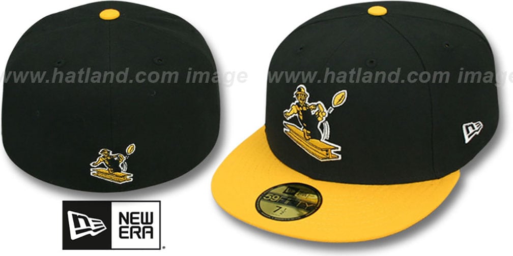 Authentic and ORIGINAL 59Fifty fitted hat by New Era, black authentic poly deep crown with the high tech fabric that has revolutionary wicking ability, superior drying, and is shrink resistant, team color gold visor with grey undervisor, raised embroidered Throwback team logo on front, smaller embroidered Throwback team logo font on back. This Pittsburgh Steelers hat is made by New Era and is licensed by the NFL National Football League.