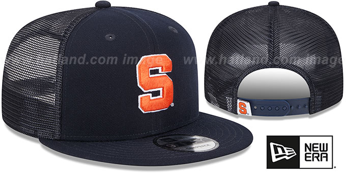 Original fit 9FIFTY adjustable hat by New Era that has similar deep crown and flat brim fit as the 59-Fifty, navy blue authentic poly front panels and visor with navy trucker mesh middle and back panels, light grey undervisor, raised embroidered team logo on front, embroidered New Era flag on side, matching adjustable Snapback closure with team logo hangtag. This Syracuse Orange hat is made by New Era and is licensed by the NCAA - National Collegiate Athletics Association.