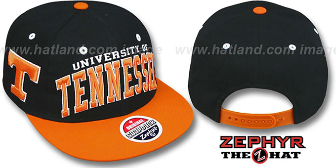 Authentic wool blend adjustable hat by Zephyr with original cut and flat brim, black crown and team color orange visor, throwback kelly green undervisor, large raised embroidered arched team name on front, team logo embroidered on side, adjustable plastic Snapback strap on back in secondary team color. This Tennessee Volunteers hat is made by Zephyr and is licensed by the NCAA - College.