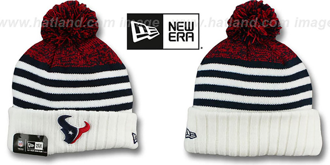 100% acrylic ribbed knit navy blue and white striped crown with white cuff, embroidered team logo on front, team color pom-pom on top, small New Era Flag embroidery on side. This Houston Texans hat is made by New Era and is licensed by the NFL National Football League.