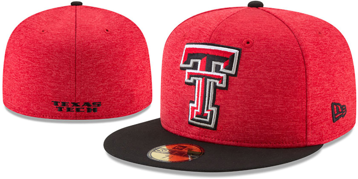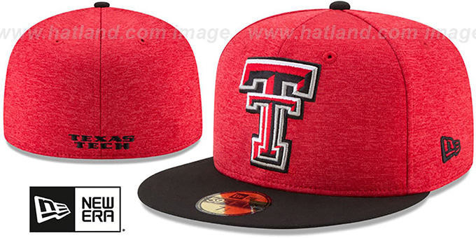Authentic and ORIGINAL 59FIFTY poly fitted hat by New Era, shadow tech heather red deep crown and solid black visor, light grey undervisor, raised embroidered team logo on front, embroidered New Era logo on side, secondary team logo font embroidered on back. This Texas Tech Red Raiders baseball cap is made by New Era and is licensed by the NCAA - College.