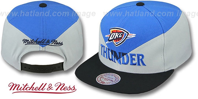 Authentic wool blend adjustable hat by Mitchell & Ness with original cut and flat brim, team color blue and grey diamond cut crown with black visor, throwback kelly green undervisor, raised embroidered team name and team logo, embroidered Mitchell & Ness logo on back above team color adjustable plastic Snapback strap. This item is on SALE!. This Oklahoma City Thunder hat is made by Mitchell & Ness and is licensed by the NBA - National Basketball Association.