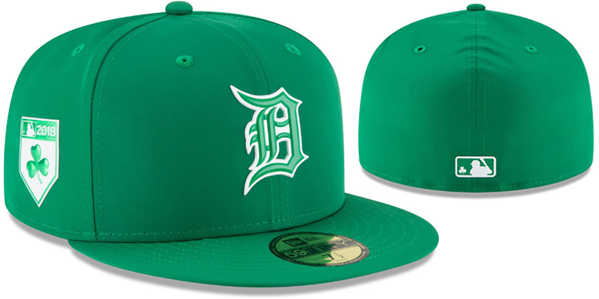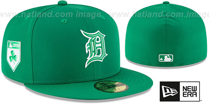 Authentic and ORIGINAL 59FIFTY fitted hat by New Era, kelly green Featherweight poly ProLight moisture wicking and UV protective performance deep crown and visor, light grey undervisor, beveled rubber team logo on front in kelly green and white, matching beveled rubber Shamrock shield side patch, matching beveled rubber MLB logo on back with shamrock inside logo, This is the style of Onfield hat worn by all MLB teams for St Patrick's Day 2018. This Detroit Tigers baseball cap is made by New Era and is licensed by the MLB - Major League Baseball.