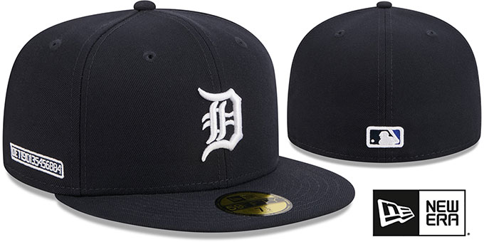 MLB Authentic Collection and ORIGINAL 59FIFTY fitted performance poly hat by New Era, navy blue crown and visor, black and royal blue print undervisor, raised embroidered City Connect team logo on front, City Connect embroidery on side, embroidered New Era logo on opposite side, matching raised embroidered MLB logo on back, This is the style of Onfield hat worn by MLB teams during the City Connect games. This Detroit Tigers baseball cap is made by New Era and is licensed by the MLB - Major League Baseball.