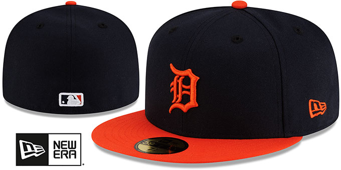 MLB Authentic Collection and ORIGINAL 59FIFTY fitted performance poly hat by New Era, navy blue deep crown and orange visor, black undervisor, raised embroidered team logo on front in orange, embroidered New Era logo on side, raised embroidered MLB logo on back, This is the style of Onfield hat worn by all MLB teams during the MLB season. This Detroit Tigers baseball cap is made by New Era and is licensed by the MLB - Major League Baseball.