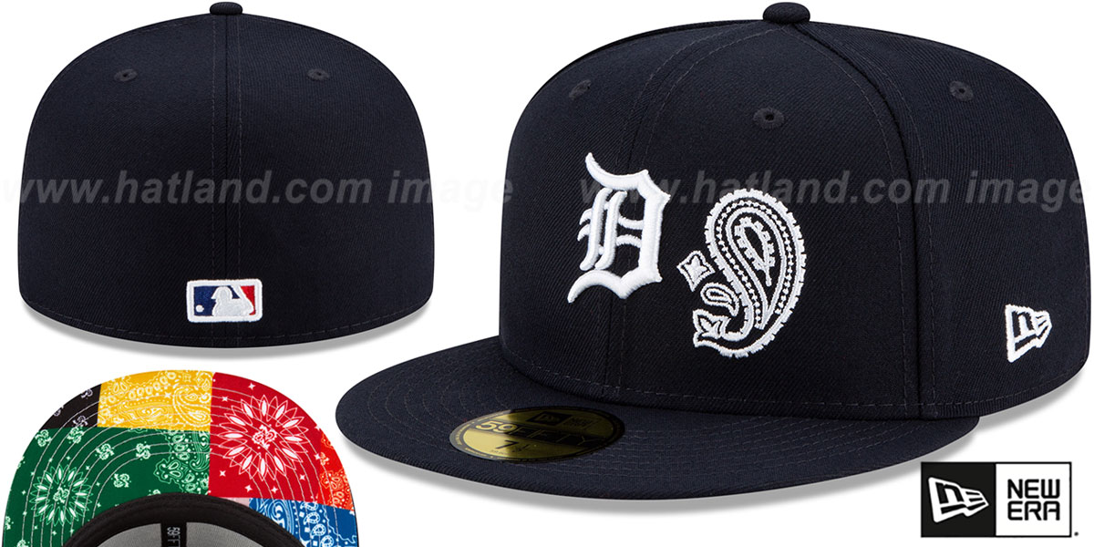 Authentic and ORIGINAL 59FIFTY fitted hat by New Era, navy blue authentic poly crown and visor, multi colored bandana quilt printed undervisor-bottom, raised embroidered team logo on front with embroidered paisley to the side, white embroidered New Era logo on side, raised embroidered MLB logo on back in team colors. This Detroit Tigers baseball cap is made by New Era and is licensed by the MLB - Major League Baseball.