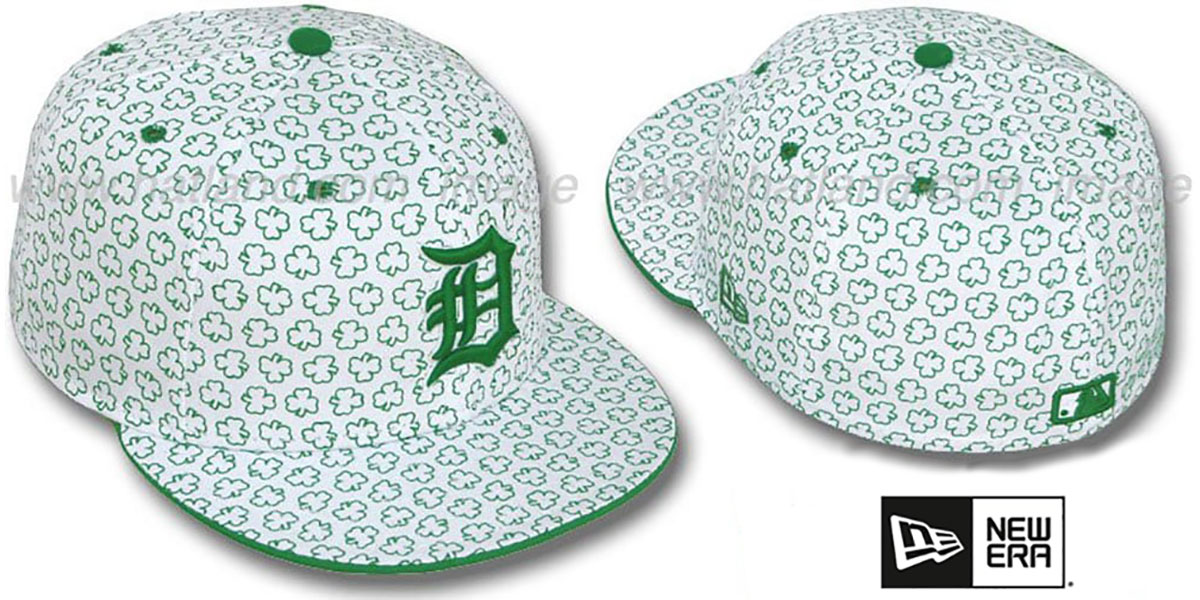 Authentic New Era ORIGINAL 59FIFTY fitted hat, white cotton deep crown and visor with New Era EXCLUSIVE St Patricks CLOVER Flocking print in kelly green, raised team logo on front in green and white, matching MLB logo on back. This Detroit Tigers baseball cap is made by New Era and is licensed by the MLB - Major League Baseball.