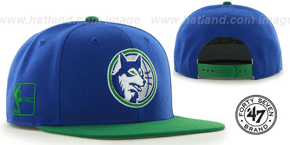 Authentic wool blend adjustable hat by Twin 47 Brand with original cut and flat brim, royal blue crown and kelly green visor, light grey undervisor, raised embroidered team logo on front, matching embroidered HWC logo embroidered on side, matching adjustable plastic Snapback strap closure. This Minnesota Timberwolves hat is made by 47 Brand and is licensed by the NBA - National Basketball Association.