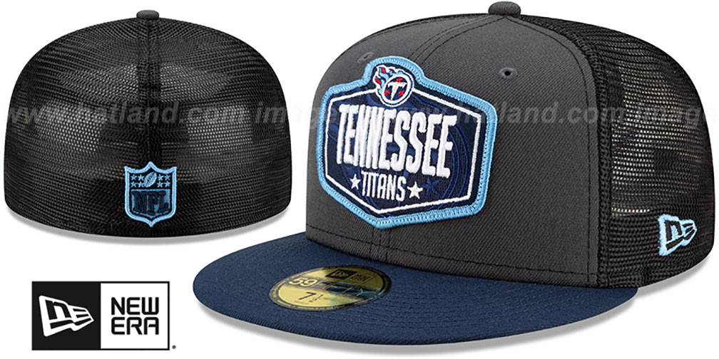 Authentic and ORIGINAL 59Fifty fitted hat by New Era, charcoal (dark) grey front panels with black trucker mesh middle and back panels, navy blue visor and black undervisor, raised embroidered 2021 NFL Draft team patch on front, embroidered New Era logo on side, raised embroidered NFL shield logo on back in team colors, The 59FIFTY hat worn during the 2021 NFL Draft. This Tennessee Titans baseball cap is made by New Era and is licensed by the NFL National Football League.