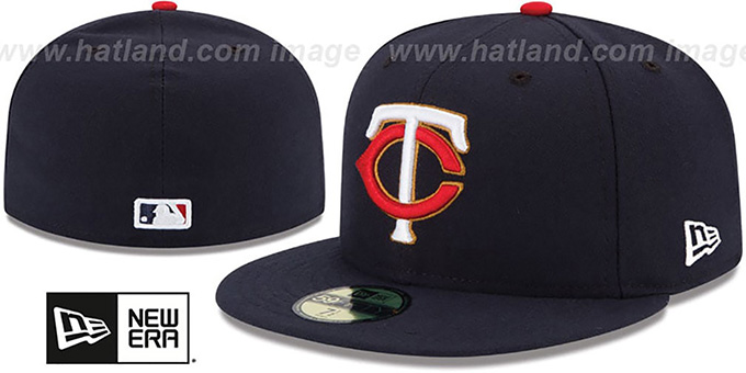 MLB Authentic Collection and ORIGINAL 59FIFTY fitted performance poly hat by New Era, navy blue deep crown and visor, black undervisor, raised embroidered team logo on front with gold outline, embroidered New Era logo on side, raised embroidered MLB logo on back, This is the style of Onfield hat worn by all MLB teams during the MLB season. This Minnesota Twins baseball cap is made by New Era and is licensed by the MLB - Major League Baseball.