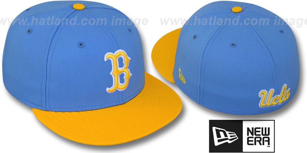 Authentic and ORIGINAL 59FIFTY fitted hat by New Era, sky (light) blue wool blend deep crown and undervisor, yellow gold visor, raised embroidered team logo on front, raised embroidered secondary team logo on back. This UCLA Bruins baseball cap is made by New Era and is licensed by the NCAA College.