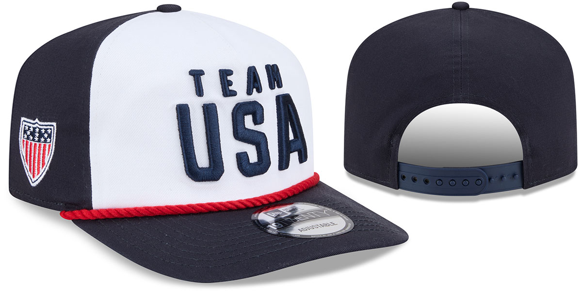 Authentic poly adjustable hat by New Era 19TWENTY with 5-Panel cut and precurved brim, navy blue crown and visor with white front panel, red rope ablove brim on front, kelly green undervisor, raised embroidered TEAM USA on front in navy blue, embroidered shield logo on side in red-white-navy, New Era flag embroidered on opposite side, navy blue Snapback adjustable closure on back. This USA hat is made by New Era and is licensed by the United States.