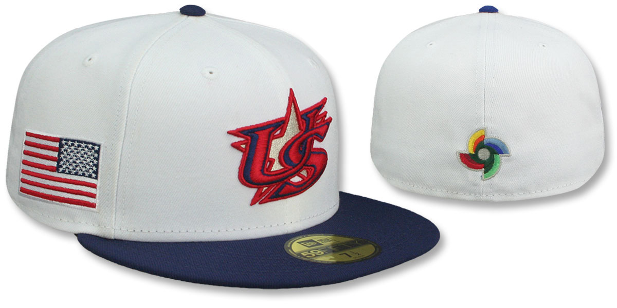 Authentic and ORIGINAL 59FIFTY fitted hat by New Era, white authentic poly crown and navy blue visor, light grey undervisor, raised embroidered World Baseball Classic team logo on front, embroidered country flag on side, embroidered WBC logo on back, This is a white crown style of On-field hat worn by all teams during the 2023 World Baseball Classic, This was designed by HATLAND.com to match the white WBC On-field jerseys. This baseball cap is made by New Era and is licensed by the WBC World Baseball Classic.