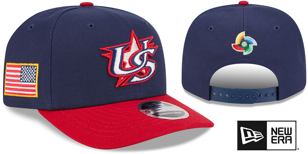 Authentic poly adjustable hat by New Era 9SEVENTY with rounded crown and slightly curved brim, navy blue crown and red visor, light grey undervisor, raised embroidered World Baseball Classic team logo on front, embroidered country flag on side, WBC embroidered logo above navy adjustable Stretch Snapback closure, This is the snapback version of the style of On-field hat worn by all teams during the 2026 World Baseball Classic, . This hat is made by New Era and is licensed by the WBC World Baseball Classic.