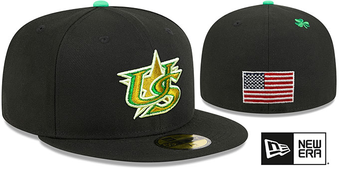 Authentic and ORIGINAL 59FIFTY fitted hat by New Era, black authentic poly crown and visor, black undervisor, green and black plaid inside crown on front panels, raised embroidered USA Baseball logo on front in kelly green, gold and off white, matching embroidered New Era logo on side, kelly green embroidered shamrock on backside top of crown, raised embroidered USA flag on back, This is the style of On-field hat worn by the USA Baseball team in the 2026 ST PATRICKS DAY games. This baseball cap is made by New Era and is licensed by the WBC - World Baseball Classic.