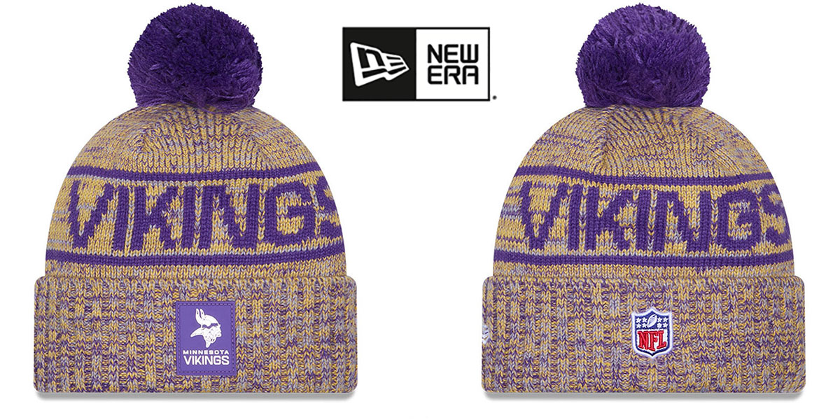acrylic ribbed knit crown with team heathered team color pattern with team name and horizontal stripes, rubberized team logo patch on front with team logo and team name on cuff, soft light grey poly/wool flannel liner, New Era Flag embroidery on side, embroidered NFL shield logo on back, matching team color pom-pom on top. This Minnesota Vikings hat is made by New Era and is licensed by the NFL - National Football League.