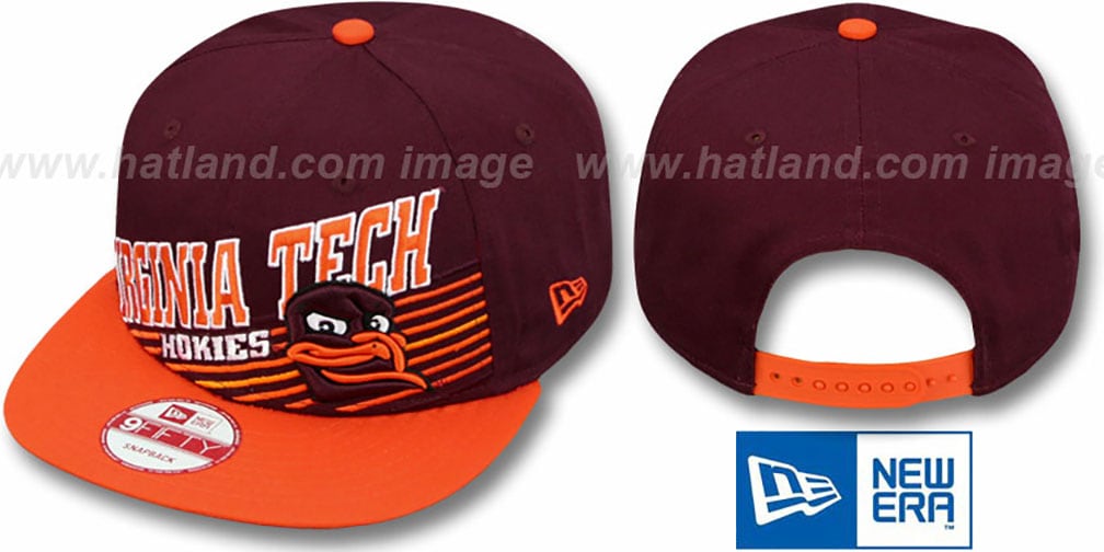 Original fit 9FIFTY adjustable cotton twill hat by New Era that has similar deep crown and flat brim fit as the 59-Fifty, burgundy crown with orange visor and throwback kelly green undervisor, embroidered Angled team color stripes on front panels with embroidered city and team name and team logo, embroidered team logo on side, New Era logo on opposite side, secondary team color plastic adjustable Snapback strap. This item is on SALE!. This Virginia Tech Hokies hat is made by New Era and is licensed by the NCAA - College.