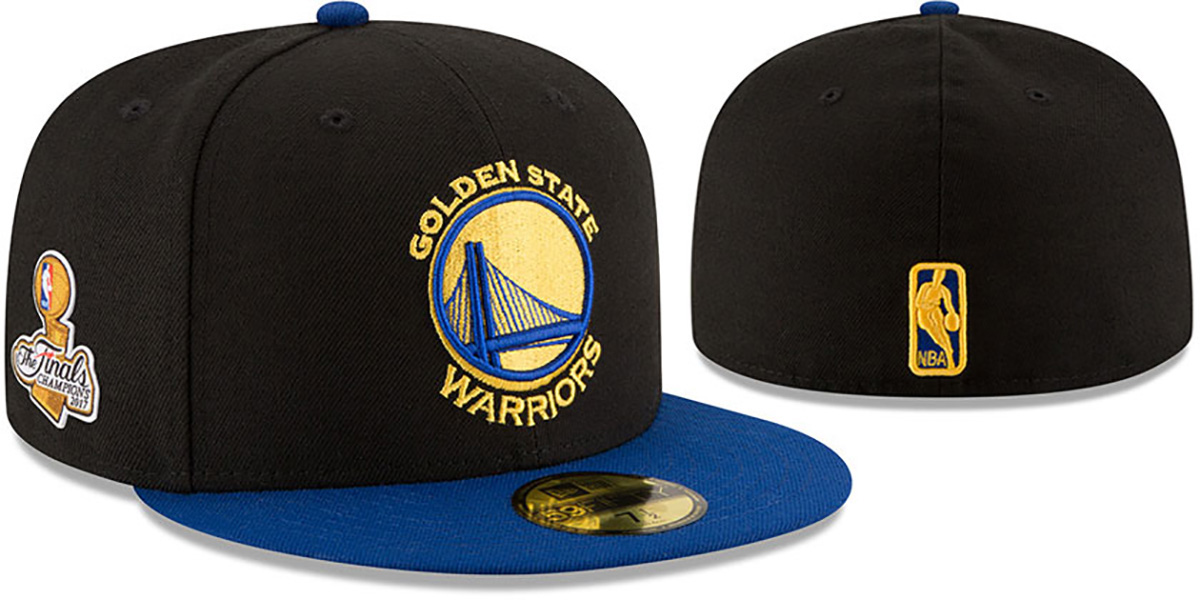 Authentic and ORIGINAL 59Fifty fitted hat by New Era, black authentic poly deep crown and royal blue visor, light grey undervisor, raised embroidered team logo on front, embroidered New Era flag logo on side, embroidered 2017 Finals Champions Trophy logo applique on opposite side, embroidered NBA logo on back. This Golden State Warriors hat is made by New Era and is licensed by the NBA - National Basketball Association.