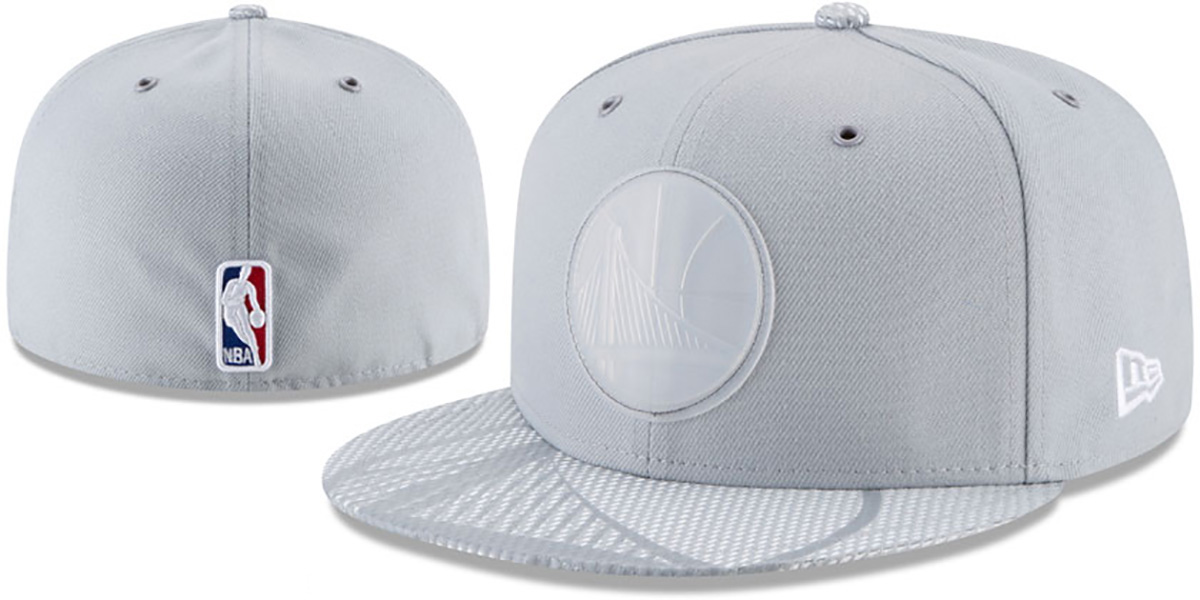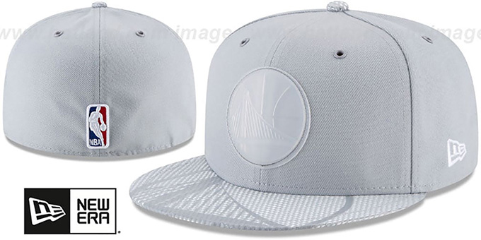 Authentic and ORIGINAL 59Fifty fitted hat by New Era, light grey authentic poly deep crown with matching metal eyelets, light grey metallic textured mesh visor with tonal team logo print, charcoal grey undervisor, raised rubberized team logo on front in clear, embroidered New Era logo on side, raised embroidered NBA logo on back, The 59FIFTY hat worn oncourt and locker room during and after the 2018 NBA All-Star game. This Golden State Warriors baseball cap is made by New Era and is licensed by the NBA - National Basketball Association.
