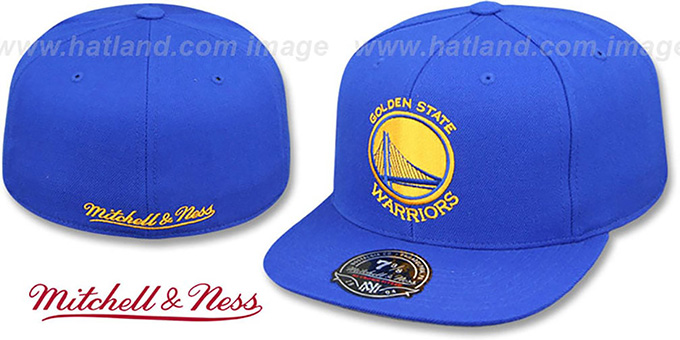 Authentic wool fitted hat by Mitchell & Ness with original cut and flat brim, royal blue crown and visor with light grey undervisor, embroidered team logo on front, Mitchell & Ness script embroidery on back. This Golden State Warriors hat is made by Mitchell & Ness and is licensed by the NBA National Basketball Association.