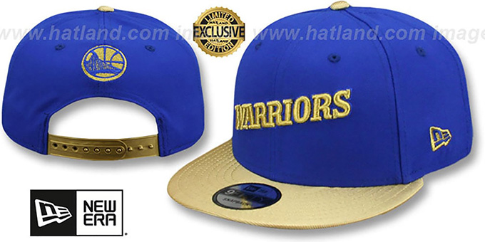 Designed by HATLAND.COM to match the old gold dazzle NBA Swingman jersey Original fit 9FIFTY adjustable hat by New Era with deep crown and flat brim, royal blue authentic poly crown and old gold dazzle visor, light grey undervisor, raised embroidered team arched logo on front, embroidered 2 color New Era logo on side, matching embroidered team logo on back above old gold adjustable snapback closure. This Golden State Warriors hat is made by New Era and is licensed by the NBA - National Basketball Association.