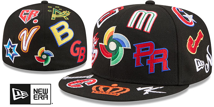 Authentic and ORIGINAL 59Fifty polyester fitted hat by New Era, black deep crown and visor and light grey undervisor, raised embroidered WBC logo on front, WBC Country logos embroidered ALL-OVER deep crown and visor in team colors, matching embroidered WBC logo on back. This hat is made by New Era and is licensed by the WBC - World Baseball Classic.