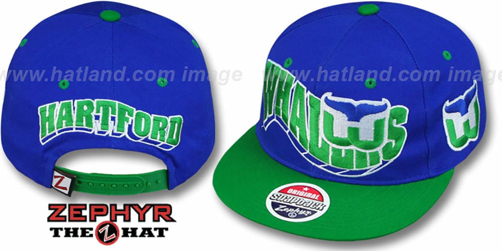 Authentic cotton twill adjustable hat by Zephyr with original cut and flat brim, royal blue crown and kelly green visor, throwback kelly green undervisor, large raised embroidered team name 'Flashback wave design' on front with team logo, team logo embroidered on side, matching embroidered team name on back, adjustable plastic Snapback strap on back in secondary team color. This Hartford Whalers hat is made by Zephyr and is licensed by the NHL - National Hockey League.