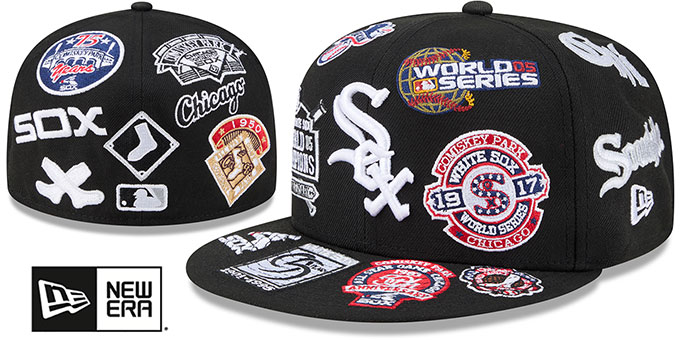 Authentic and ORIGINAL 59Fifty fitted hat by New Era, black authentic poly deep crown and visor with a light grey undervisor, raised embroidered team logo on front, embroidered Cooperstown and associated team logos embroidered ALL-OVER crown and visor, embroidered MLB Batterman logo on back. This Chicago White Sox hat is made by New Era and is licensed by the MLB - Major League Baseball.