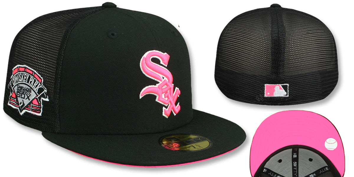 Authentic and Original 59Fifty fitted hat by New Era, black authentic poly front panels and visor with black trucker mesh middle and back panels, neon pink undervisor, black sweatband, raised embroidered team logo on front in neon pink with white outline, matching embroidered COMISKEY PARK side-patch on side, matching embroidered New Era logo on opposite side, matching raised embroidered MLB Cooperstown logo on back. This Chicago White Sox hat is made by New Era and is licensed by the MLB - Major League Baseball.