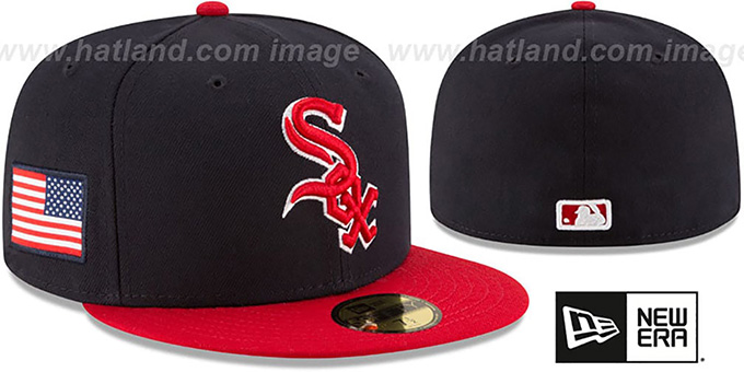 Authentic and Original 59FIFTY fitted hat by New Era, navy blue poly deep crown and red visor, light grey undervisor, raised embroidered team logo on front in red and white, embroidered side patch USA Flag applique, New Era Flag on opposite side, matching raised embroidered MLB logo on back. This Chicago White Sox baseball cap is made by New Era and is licensed by the MLB - Major League Baseball.