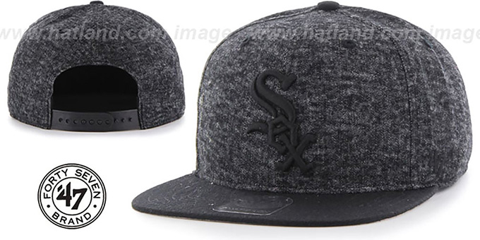 Authentic cotton blend adjustable hat by Twin 47 Brand with original cut and flat brim, black heather crown and black visor, light grey undervisor, raised embroidered team logo on front in black, black adjustable plastic Snapback strap closure. This Chicago White Sox hat is made by 47 Brand and is licensed by the MLB - Major League Baseball.
