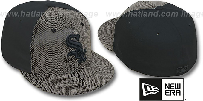 CLEARANCE SALE!!!'Authentic' and Original 59FIFTY fitted hat by New Era, snake skin print front panels and visor, black middle and back panels and undervisor, black raised embroidered team logo on front and matching MLB logo on back. This Chicago White Sox baseball cap is made by New Era and is licensed by the MLB - Major League Baseball.