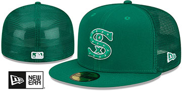 Authentic New Era ORIGINAL 59FIFTY fitted hat, kelly green cotton front panels and visor with New Era EXCLUSIVE St Patricks SHAMROCK Flocking print in white, white undervisor and flip, white trucker mesh mids and back panels with white piping between mid and front panels, raised embroidered team logo on front in white, matching MLB logo on back. This Chicago White Sox baseball cap is made by New Era and is licensed by the MLB - Major League Baseball.