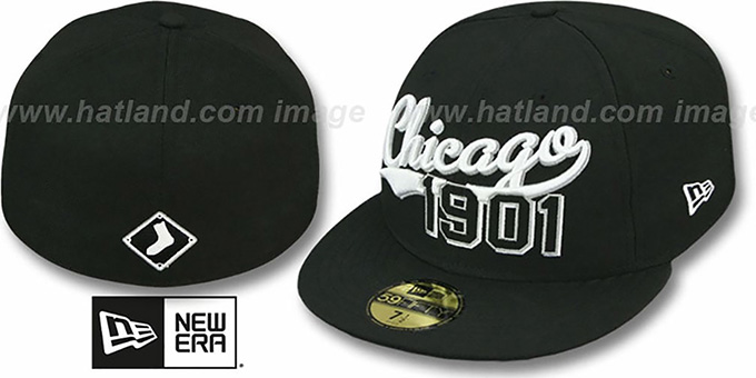 Authentic and ORIGINAL 59Fifty fitted hat by New Era, black wool deep crown and visor with black undervisor, raised embroidered Team Script above the year team was founded on front, smaller embroidered secondary team logo on back. This item is on SALE!. This Chicago White Sox hat is made by New Era and is licensed by the MLB - Major League Baseball.