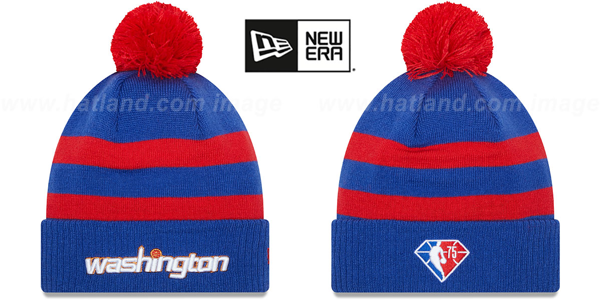 100% acrylic royal blue with team color stripes knit beanie and ribbed cuff, raised embroidered City Edition logo on front of cuff, embroidered New Era logo on side, raised embroidered 75th Anniversary NBA logo on back, Produced to match NBA City Edition Jerseys worn throughout select 2021-2022 games. This Washington Wizards hat is made by New Era and is licensed by the NBA - National Basketball Association.