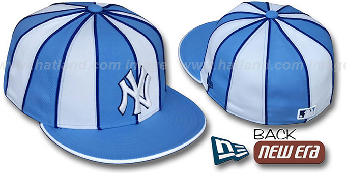 Authentic and Original 5950 fitted hat by New Era, rotating '12-Panel' baby blue and white crown with blue undervisor and flip, navy blue piping on all seams, raised embroidered team logo on front in matching colors, MLB logo on back. This New York Yankees hat is made by New Era and is licensed by the MLB - Major League Baseball.
