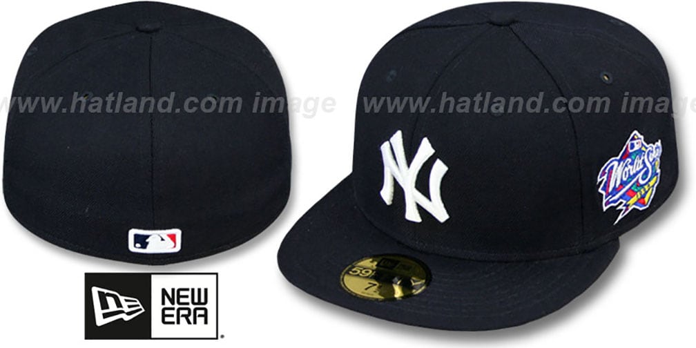 Authentic Collection 59FIFTY wool fitted hat by New Era, team color navy blue deep crown and visor, light grey undervisor, raised embroidered team logo on front, 1999 WORLD SERIES embroidered patch on side, raised embroidered MLB logo on backThis is the style of hat that was worn onfield during the World Series when they won the championship . This New York Yankees baseball cap is made by New Era and is licensed by the MLB - Major League Baseball.