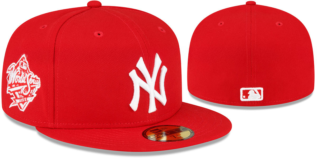 Authentic and ORIGINAL 59FIFTY fitted hat by New Era, red authentic poly crown and visor, light grey undervisor, black sweatband, raised embroidered team logo on front, embroidered 1999 WORLD SERIES logo side-patch on side in red and white, embroidered New Era logo on opposite side, matching raised embroidered MLB logo on back. This New York Yankees baseball cap is made by New Era and is licensed by the MLB - Major League Baseball.
