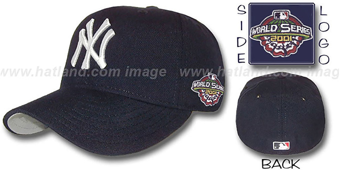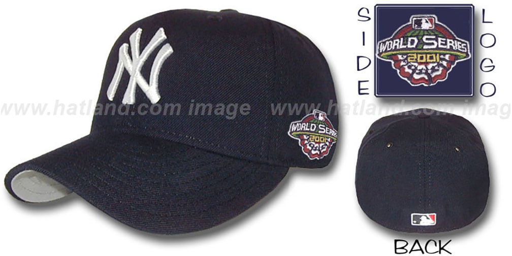 'Authentic Collection' 5950 fitted hat by NEW ERA, dark navy 100 wool crown and visor, embroidered 'NY' logo on front, MLB logo on rear of hat, 2001 WORLD SERIES embroidered patch on sideTHIS IS THE HAT THAT THE PLAYERS ARE WEARING 'ON FIELD' DURING THE 2001 WORLD SERIES GAMES. This New York Yankees hat is made by New Era and is licensed by the MLB - Major League Baseball.