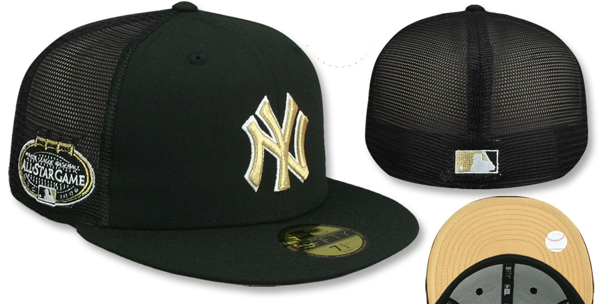 Authentic and Original 59Fifty fitted hat by New Era, black authentic poly front panels and visor with black trucker mesh middle and back panels, metallic gold undervisor, black sweatband, raised embroidered team logo on front in metallic gold with white outline, matching embroidered 2008 ALL STAR GAME side-patch on side, matching embroidered New Era logo on opposite side, matching raised embroidered MLB Cooperstown logo on back. This New York Yankees hat is made by New Era and is licensed by the MLB - Major League Baseball.