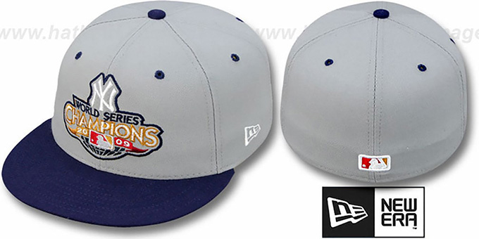 Authentic and ORIGINAL 59FIFTY wool fitted hat, light grey deep crown and navy blue visor, matching raised embroidered 2009 World Series Champions Crest on front, matching embroidered 2009 logo on back. This New York Yankees baseball cap is made by New Era and is licensed by the MLB - Major League Baseball.