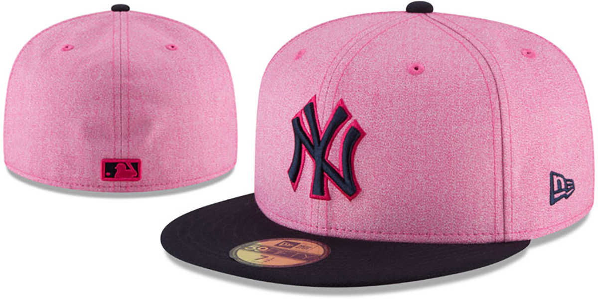 Authentic and ORIGINAL 59FIFTY poly fitted hat by New Era, shadow tech heather pink deep crown and navy blue visor, matching raised embroidered team logo on front, navy embroidered New Era logo on side, matching raised embroidered MLB logo on back , The hat worn by all MLB teams on Mother's Day 2018. This New York Yankees baseball cap is made by New Era and is licensed by the MLB - Major League Baseball.