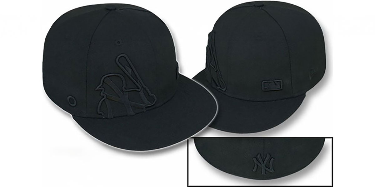 'Authentic' New Era ORIGINAL 59FIFTY fitted hat, black wool deep crown and visor, DOUBLE WHAMMY black raised embroidered MLB Silhouette Insider logo on front side panel and 'Flawless' MLB logo on opposite front side panel in black, matching raised team logo on back. This New York Yankees baseball cap is made by New Era and is licensed by the MLB - Major League Baseball.