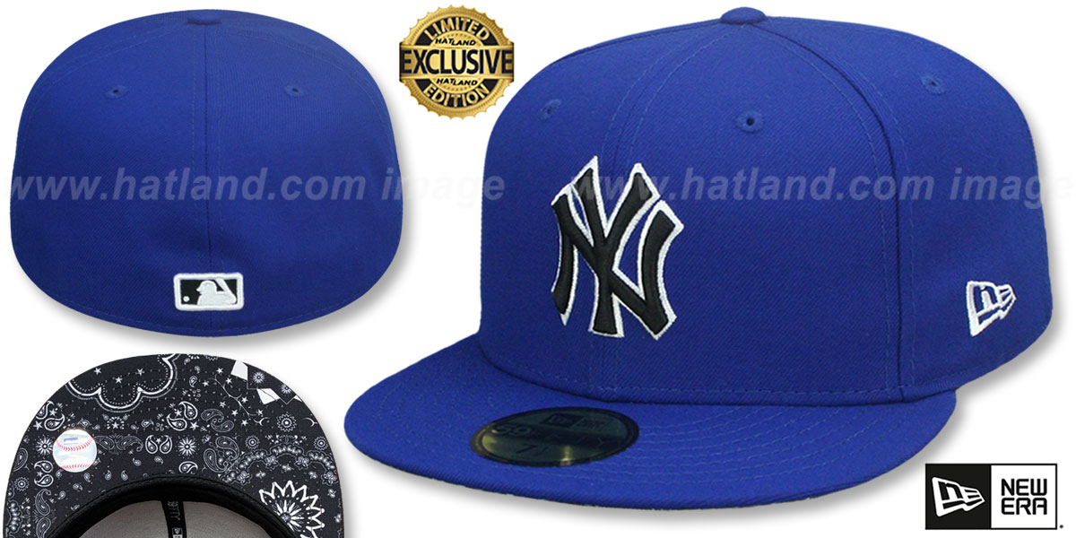 Authentic and ORIGINAL 59FIFTY fitted hat by New Era, royal blue authentic poly crown and visor, black bandana undervisor-bottom, raised embroidered team logo on front in black and white, white embroidered New Era logo on side, raised embroidered MLB logo on back in black and white, Each black bandana print will be different so that no 2 hats will have the same undervisor-bottom. This New York Yankees baseball cap is made by New Era and is licensed by the MLB - Major League Baseball.