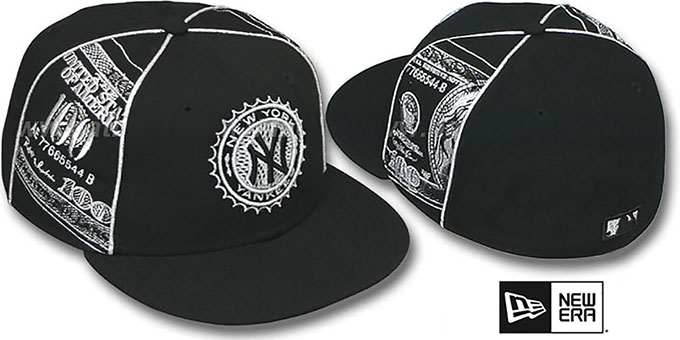 'Authentic' and Original 59FIFTY fitted hat by New Era, black wool deep crown and visor, metallic silver embroidered New Era Exclusive 'C-Note' $100 bill design on mid panels, metallic silver piping on mid seams, raised embroidered metallic silver seal on front with team logo inside seal, matching MLB logo on back. This New York Yankees baseball cap is made by New Era and is licensed by the MLB - Major League Baseball.