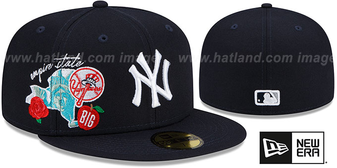 Authentic and Original 59FIFTY fitted hat by New Era, team color navy blue authentic poly crown and visor, light grey undervisor, raised embroidered team logo on front with embroidered state and city icons on side front, New Era embroidered logo on side, raised MLB logo on back. This New York Yankees baseball cap is made by New Era and is licensed by the MLB - Major League Baseball.
