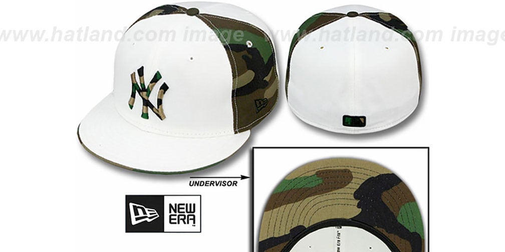 Authentic and ORIGINAL 59FIFTY fitted hat by New Era, white cotton twill front and back panels and visor, Woodland (army) Camo middle panels, undervisor and flip, matching raised embroidered team logo on front in Woodland Camo, matching MLB logo on backEACH CAMO HAT PATTERN WILL BE SLIGHTLY DIFFERENT SO NO TWO HATS WILL BE THE SAME. This New York Yankees baseball cap is made by New Era and is licensed by the MLB - Major League Baseball.